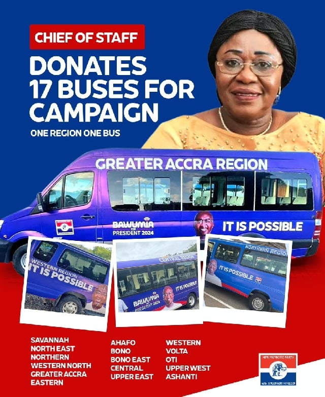 In a strategic move to bolster the New Patriotic Party’s (NPP) campaign efforts ahead of the upcoming December 7 general elections, Chief of Staff Madam Frema Osei Opare has launched an initiative designed to enhance the party’s operational capabilities across the nation. This initiative involves the distribution of seventeen buses—one for each of the NPP’s sixteen regional offices along with an additional bus for the National Headquarters. The program is aptly named the ‘One-Region-One-Bus’ initiative, highlighting its objective to strengthen the party’s outreach and mobilization efforts in preparation for the elections.
