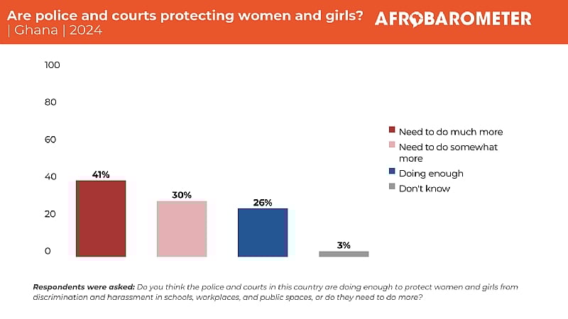Recent findings from the Afrobarometer survey indicate that a significant portion of the Ghanaian population believes there is a pressing need for law enforcement and judicial authorities to enhance their efforts in safeguarding women and girls against discrimination and harassment. Despite the gravity of the situation, only 26% of respondents feel that the police and courts are currently doing enough to protect women and girls. The survey results underscore the challenging societal landscape that women and girls navigate, with substantial reports of discrimination and harassment in both educational and public contexts. Specifically, around 20% of participants indicated that schoolgirls often face harassment or discrimination from their teachers, while approximately 16% believe that women frequently endure harassment in public settings, such as markets and public transportation.